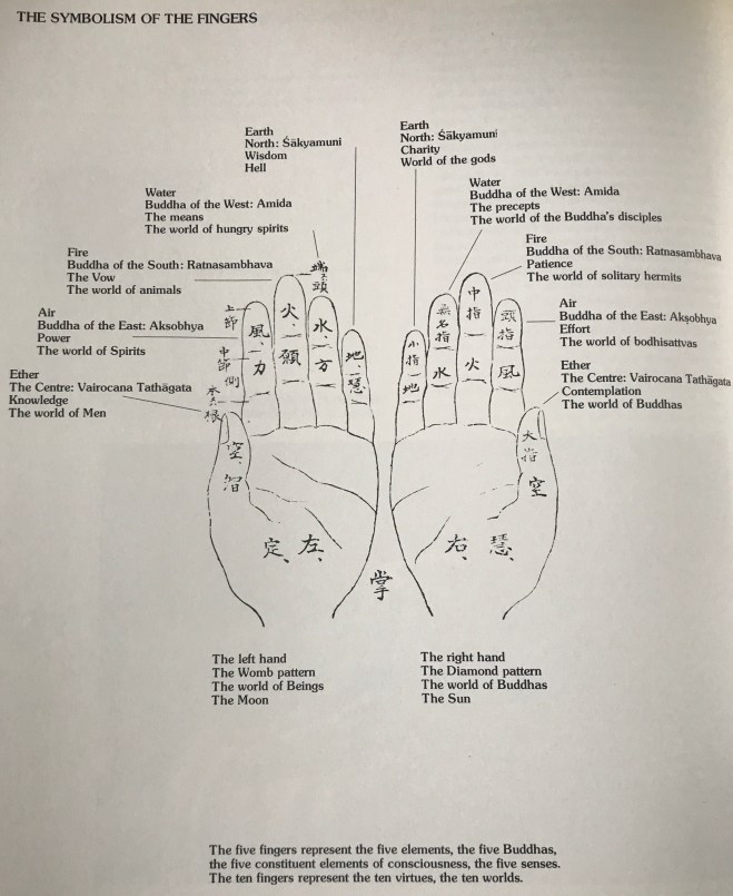 This image shows in greater detail the relationship between individual fingers and the Five Elements in Shingon Buddhism. The diagram is reproduced from ‘The Art of Japanese Tantrism‘ (1979). In this case the fingers and hands also represent a number of other attributes.