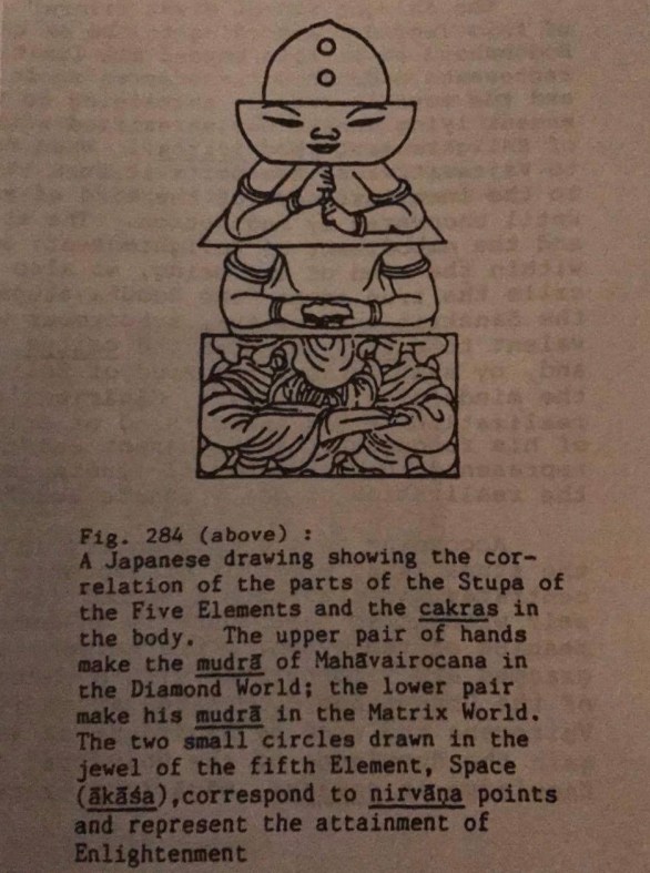 The six element mudra is also represented in the mid triangle-shaped section of this gorinto. Also known as the ‘Fist of Wisdom’ the mudra equates to the Diamond World Mandala. The gorinto (five element stupa) is only found in Japan. This diagram shows the elements both in the fingers (represented by the six element mudra) and in the body – represented here by the gorinto. The links to the cakras (also known as chakras) in the body/gorinto is of particular interest to me. The image comes from a classic text titled ‘The Symbolism of the Stupa‘ written by Adrian Snodgrass (1985). As well as describing the five elements in detail, he writes that the sixth element, consciousness, is present by implication in the stupa form.