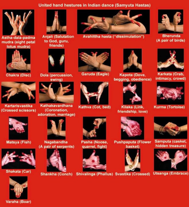 Hasta Mudras are the main focus of the book by Carroll and Carroll. 52 Hasta Mudras are found in Indian Dance, Drama, Music and Literature. They are divided into 28 single handed gestures or Asamyuta Hastas and 24 double handed gestures or Samyuta Hastas, shown here. The Hastas are used to depict stories of Indian Gods and Goddesses, as well as various characters, creatures, elements of nature, animals, emotions and relationships within a story. The elements at the performers fingertips are a crucial part of the meanings shown by the different position of the hands. Sources: shakti.e-monsite.com and pushpanjalidance.co.uk.