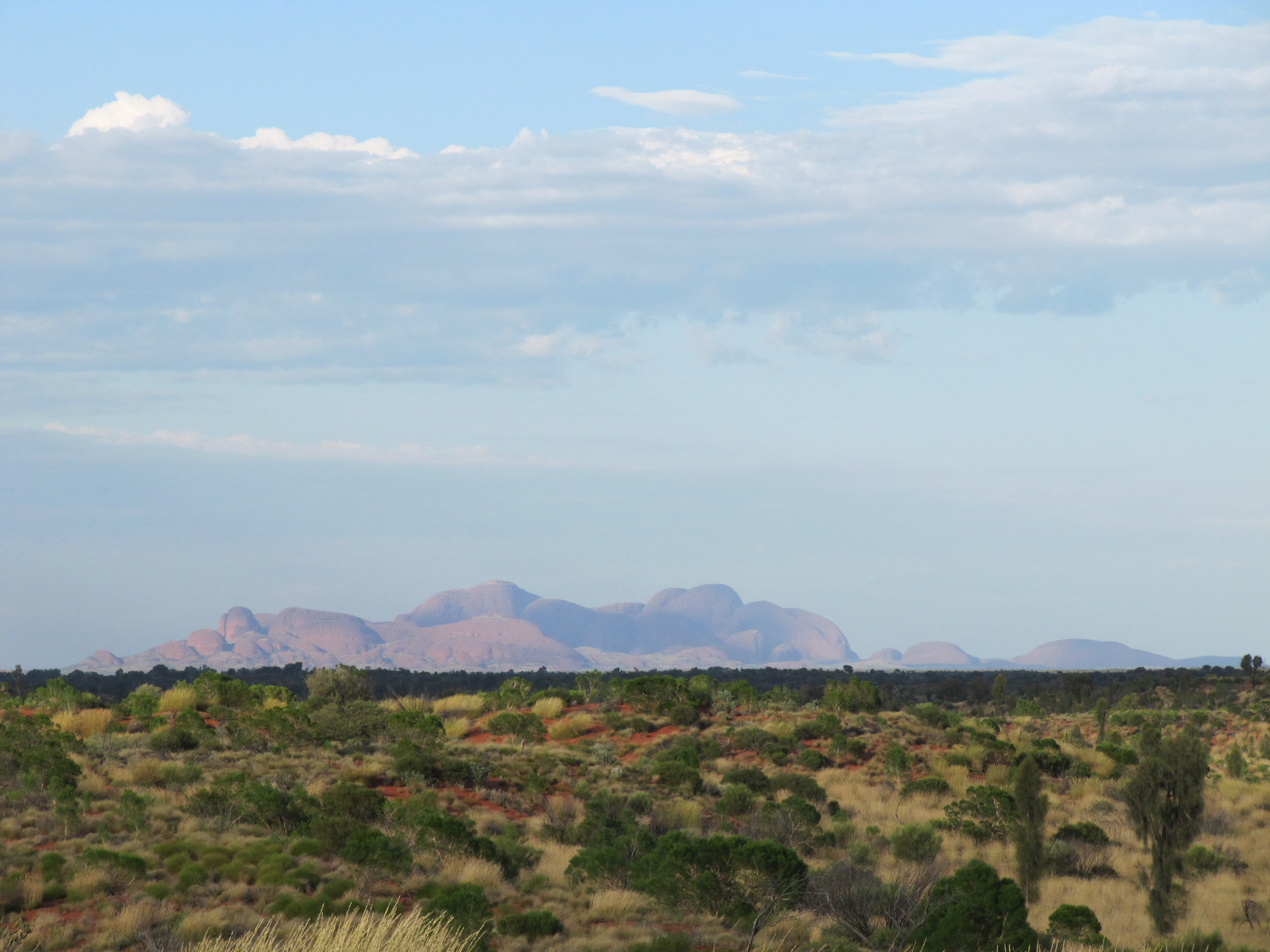 The beautiful shape, colours and presence of Kata-Tjuta on the horizon, central Australia. This is a sacred site for Indigenous Australians who consider Earth to be the primary element, according to some authors