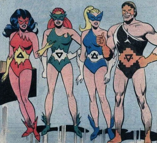 The Elementals, from left to right, Salamander, Undine, Sylph and Gnome. The symbols on their belts represent the alchemical symbols for fire, water, air and earth. Art by Ramona Fradon. Source: Wikipedia.