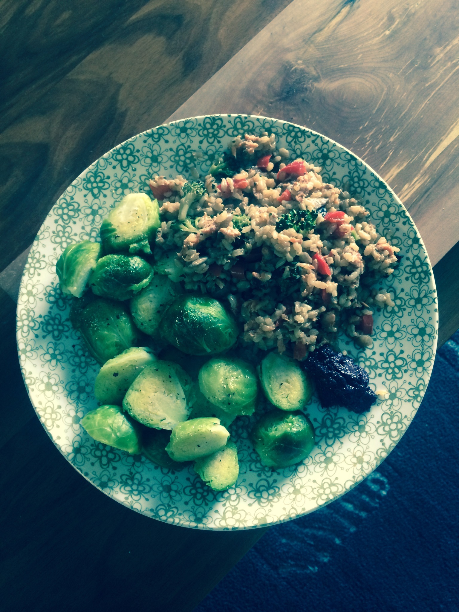 Vegetables, rice and olive paste – served on a ceramic plate, sitting on a wooden table – a marvel of the elements.