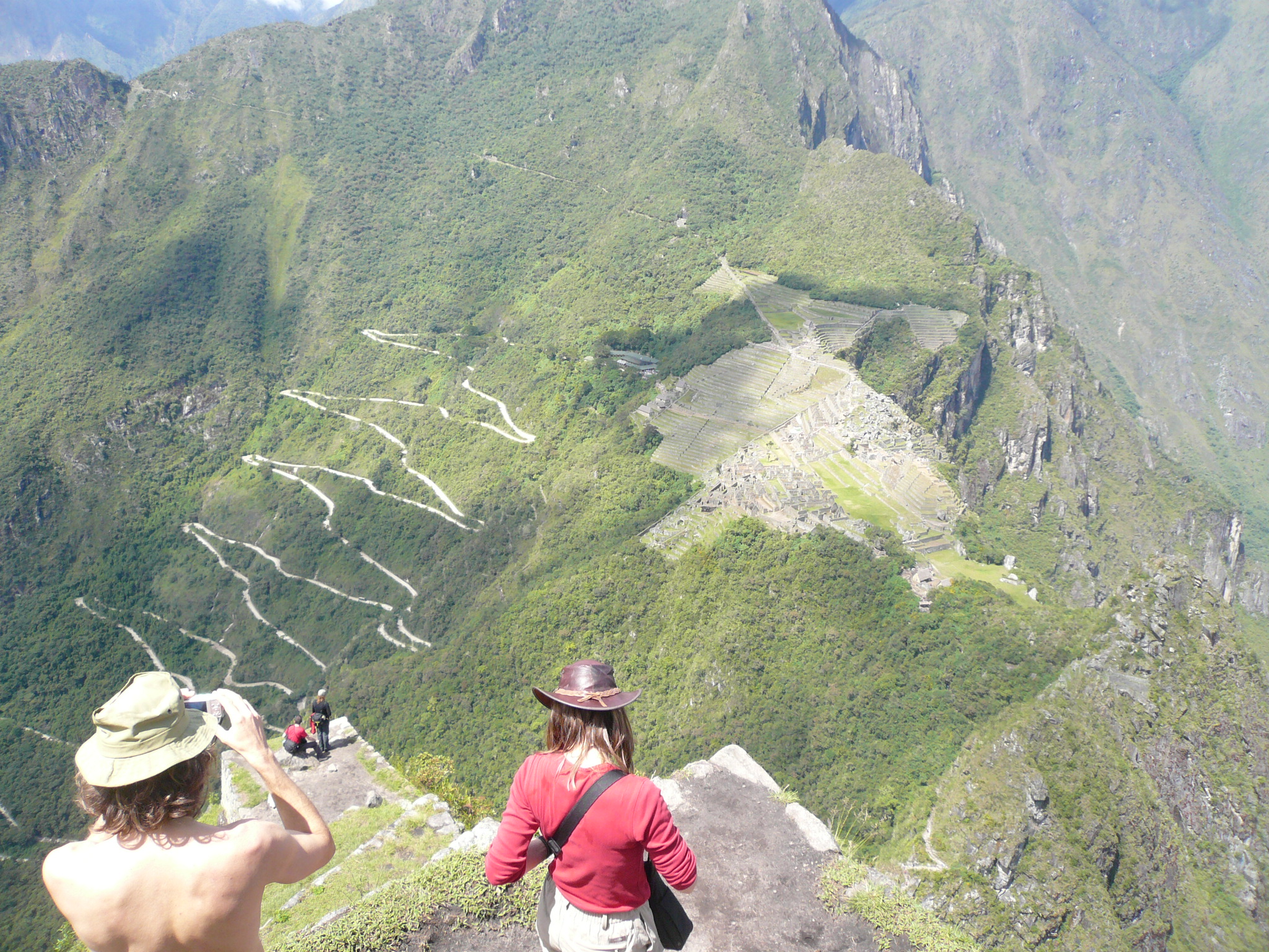 Machu Picchu and the path to the Gate of the Sun (the notch in the mountain range, far left), viewed from the top of Waynu Picchu. The engineering required to build Machu Picchu is breath-taking, especially as the Inka did not have the zig-zag road for access. While the road makes it easier to visit, it detracts from the aesthetics and sense of place.