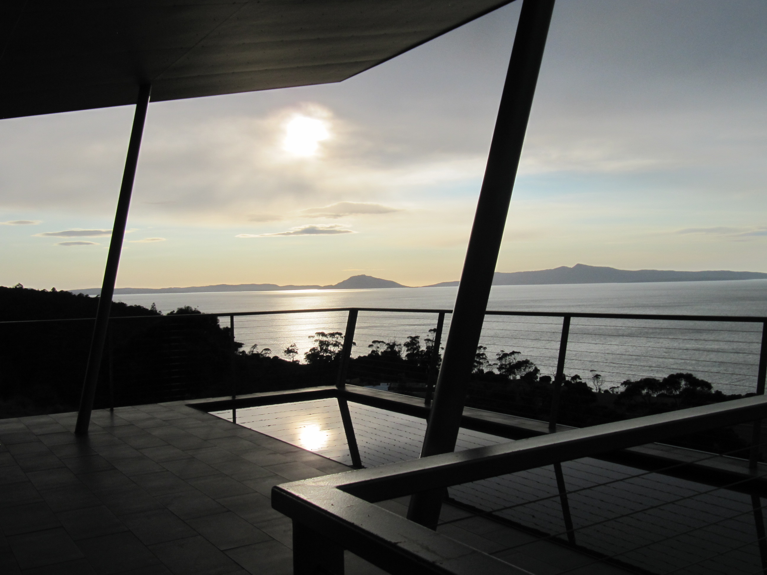 Water is often used as an elemental feature in buildings. The shallow pool shown here complements and connects to the major natural water feature the building overlooks on the East coast of Tasmania. Water features are also used to attract animals, especially birds.