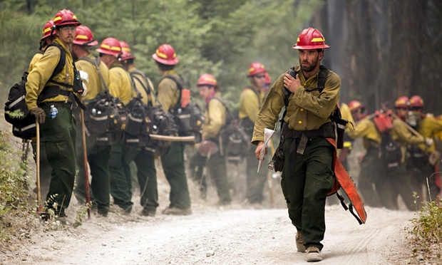 Members of a crew prepare to work on an area of unburnt brush in the Okanogan fires near Tonasket, Washington US, on 22 August 2015. Photograph: Jason Redmond, the guardian.com.