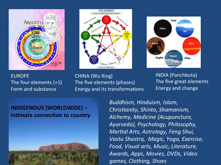 As with any presentation, it is important to set the scene. The principal elemental frameworks and breadth of regions and subjects where the elements are expressed was described. The characterisation of the elements as energy and its transformation is a common theme. While not illustrated, Japan draws on both Chinese and Indian frameworks, the latter through the influence of Buddhism. The elements are strongly embedded in other religions, belief systems and healing practices. These are just the tip of the ice-berg.