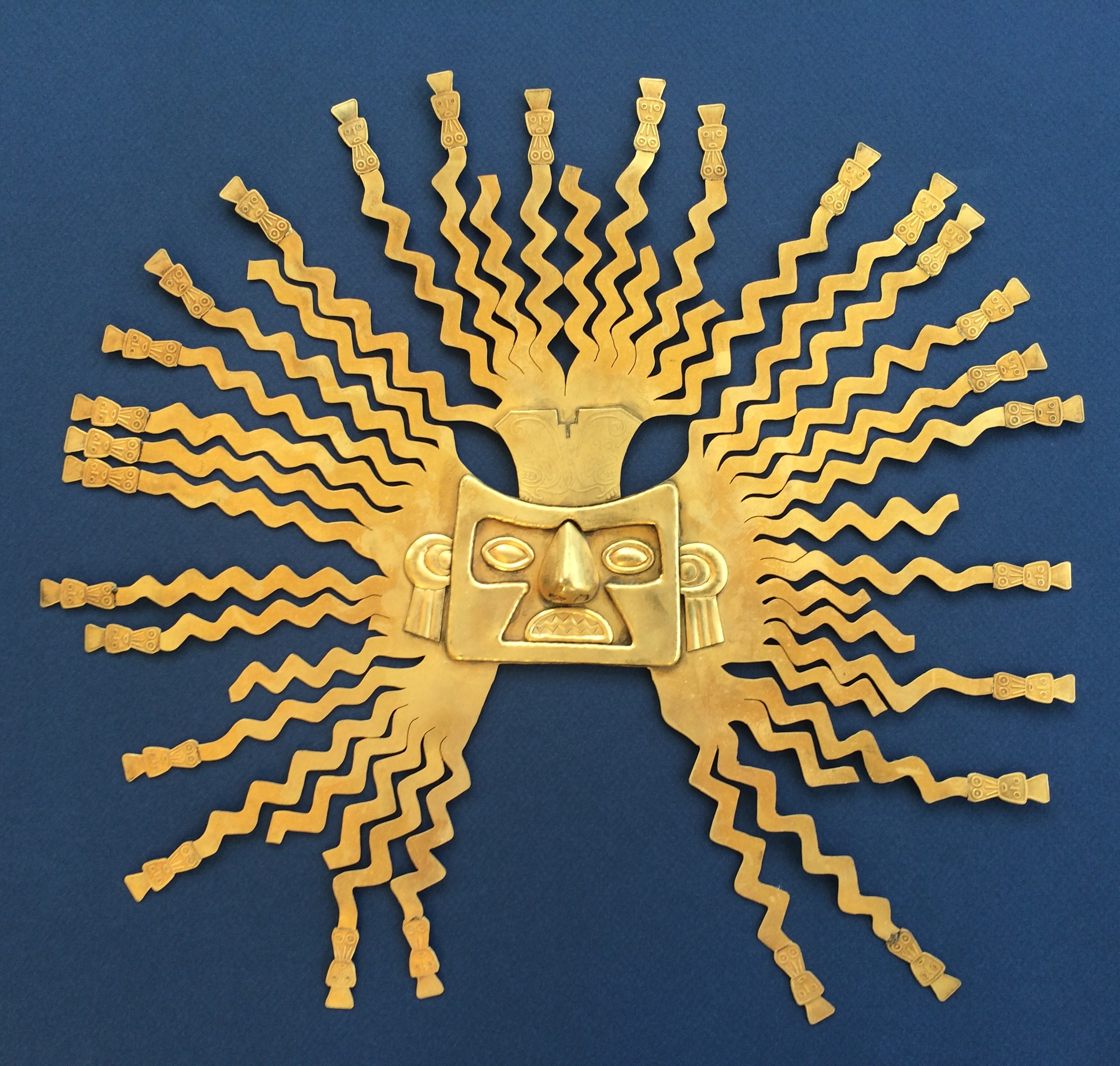 The Qurikancha (the Temple of the Sun in Cuzco, Peru) was covered with gold and filled with golden statues. In one of the tragedies of the ages, almost all of the Inca gold was melted by the Spaniards – including a large golden disk of the sun. The sun mask in this image, from the La Tolita culture in northern Ecuador, has survived the vicissitudes of time. The original is in the Museo del Banco in Quito, Ecuador. Gold was seen as a product of the sun, the ultimate expression of fire, by many cultures in South America. This mask still radiates its original energy over 2000 years after it was created.