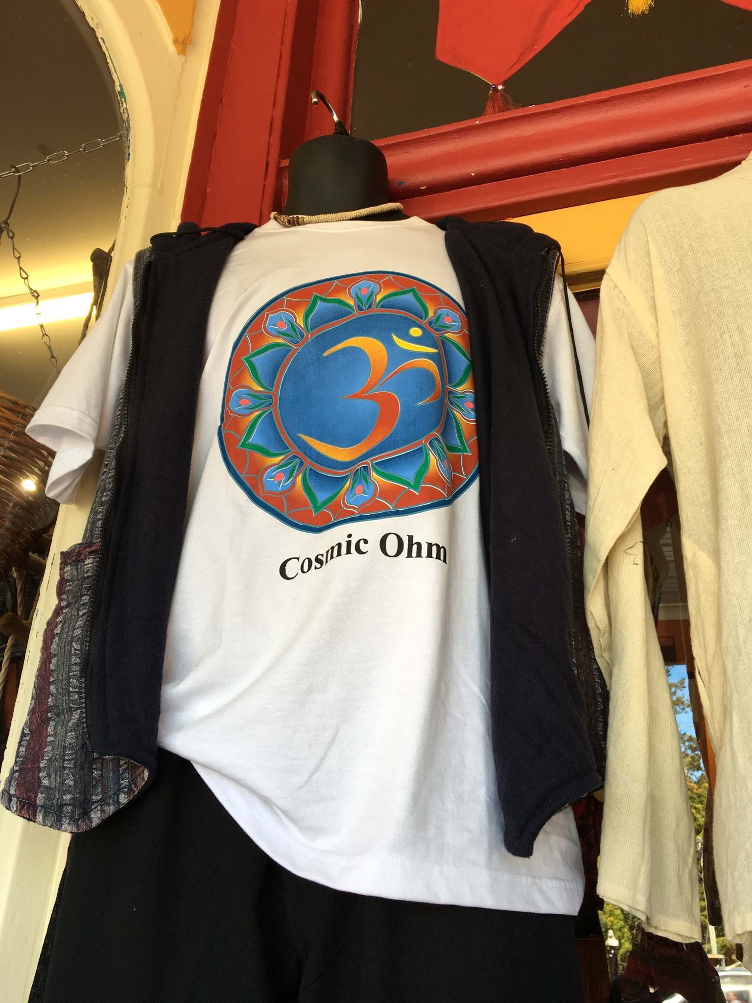 On the same day as finding the bag, I saw the Om (using the alternative spelling Ohm) symbol on a tshirt hanging outside a shop in Deloraine, Tasmania. Cosmic is a good word to connect with Om which is considered the sound that created the universe.