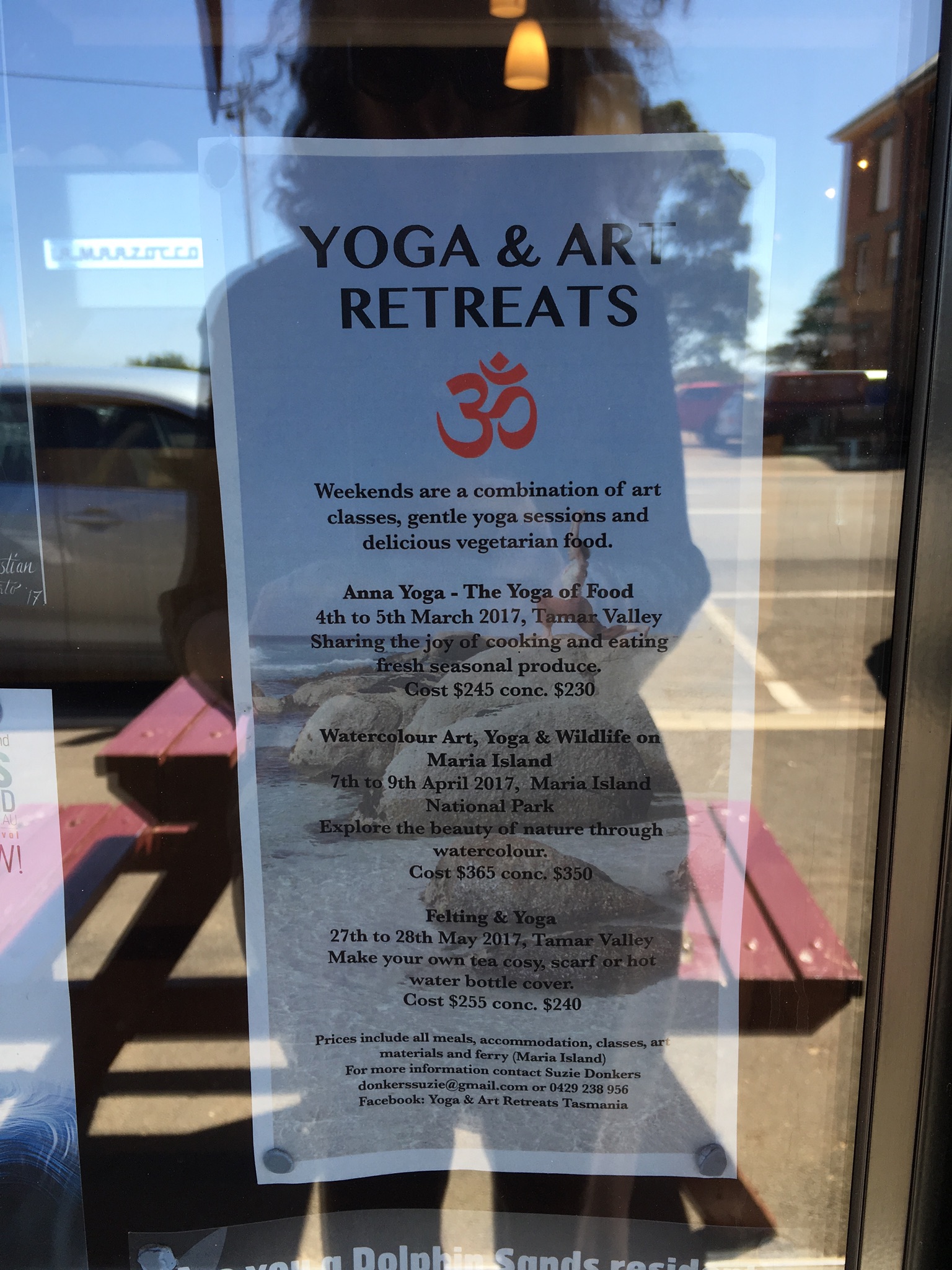My fourth sighting within 10 days was in an advertisement for Yoga & Art retreats in Eastern Tasmania. Also shown in red, the Om symbol stands out clearly in the poster even though it is behind a shop window. Om (pronounced Aum) is the mantra, or vibration, traditionally chanted at the start and end of yoga sessions. Coming from Hinduism and Yoga the chant is considered to have high spiritual and creative power. (Source: mindbodygreen.com)