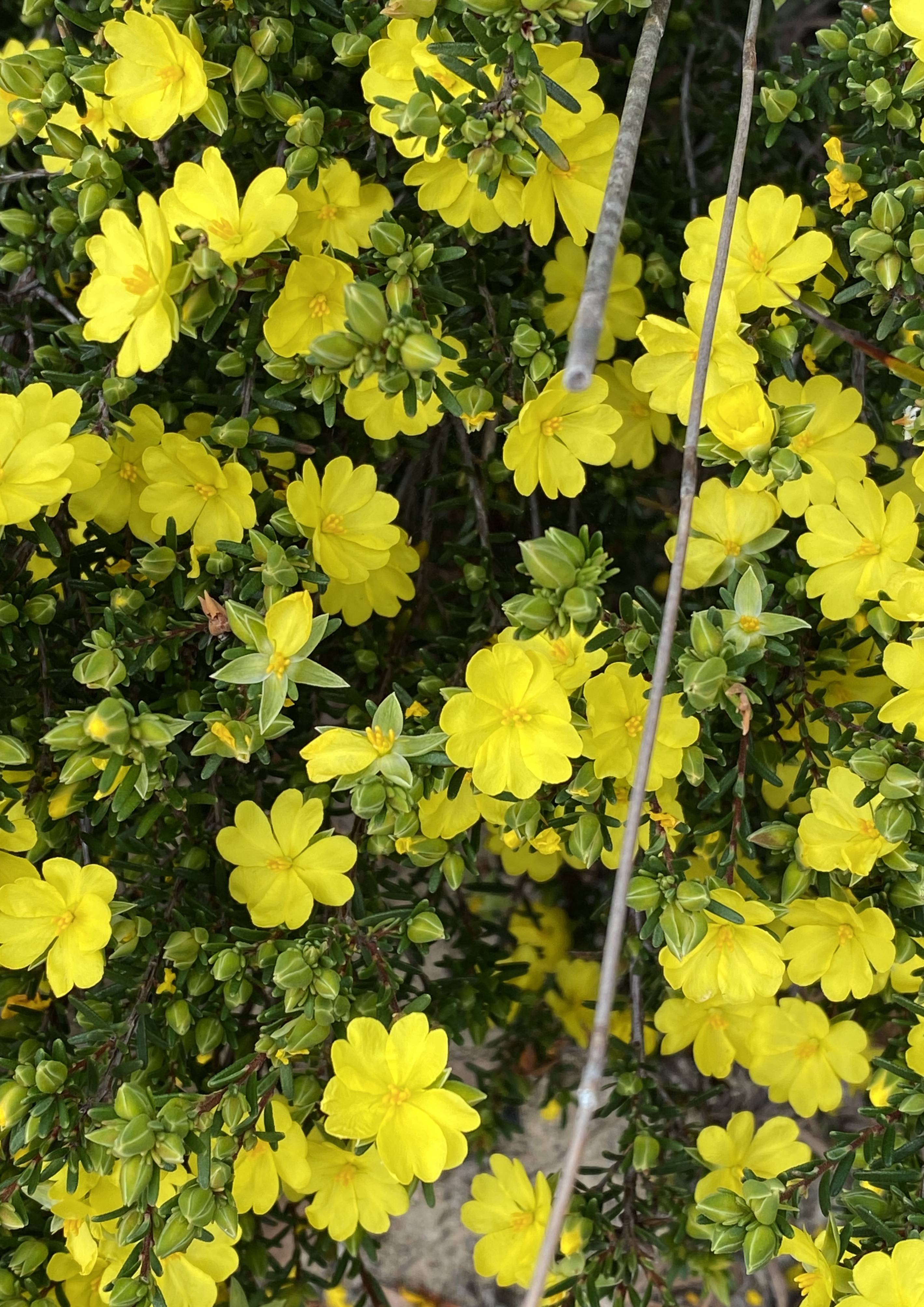 This intensely flowering and brightly coloured Hibbertia really caught my eye on the trek. The shrub was widespread on the walk. It happily reminded me of my friend Cathy who loves yellow flowers. When it rained I noticed that drops of water collect on the delicate flowers. Paying close attention to nature can be humbling when these finely tuned connections come to light.