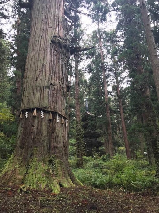 This Japanese cedar on Mt Haguro in Japan is over 1000 years old. The straw rope and white papers are Shinto symbols that identify sacred objects and places. In the background is a stunning Buddhist gojunoto (five element pagoda). Shinto and Buddhism have been intertwined to varying degrees since the latter was introduced into Japan in the sixth century AD.