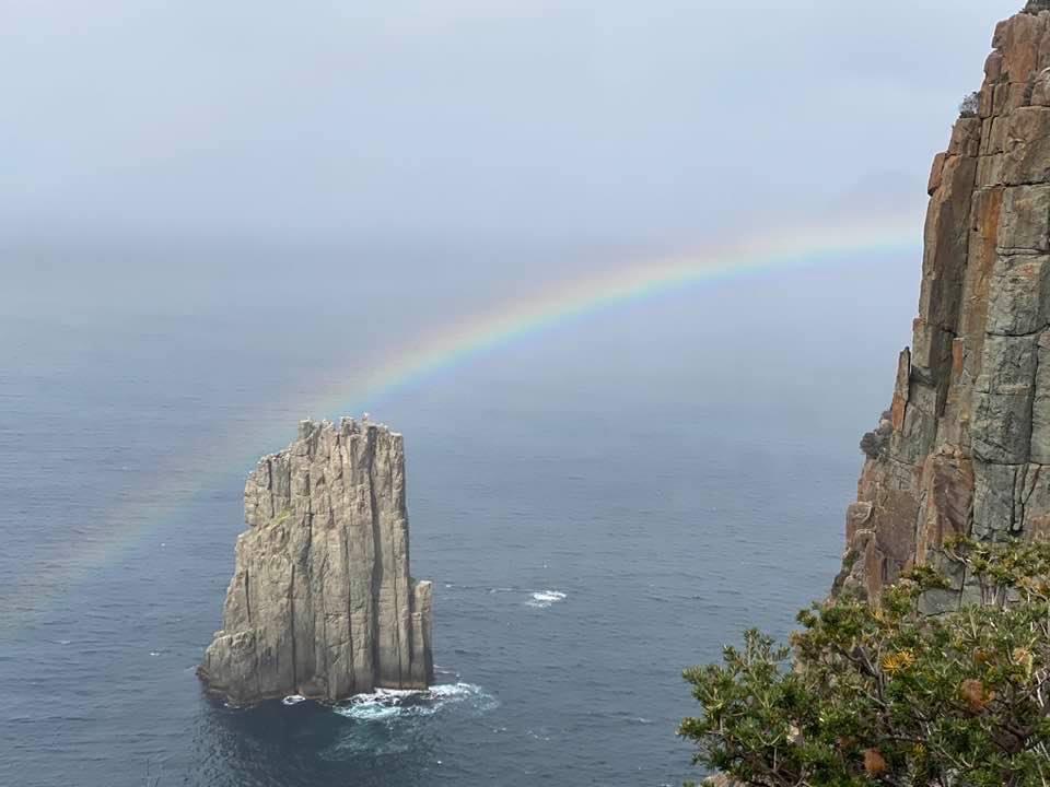 During the Three Capes walk my most enduring Shinto Moments were feeling the power of the life-force in the earth, sea and sky. The track passes through a great diversity of vegetation types, with spectacular ocean and sea cliffs views. We experienced sunshine, wind, light and heavy rain and contrasting cloud formations. The sunrise illustrated above, and rainbow below, were intense expressions of ephemeral beauty. They were magnificent. The walk was elemental to the core. Earth, fire, water, air/wind, ether and consciousness were all at play and all interconnected. Sometimes, when I found the uphill sections tiring, I drew on the earth for energy.