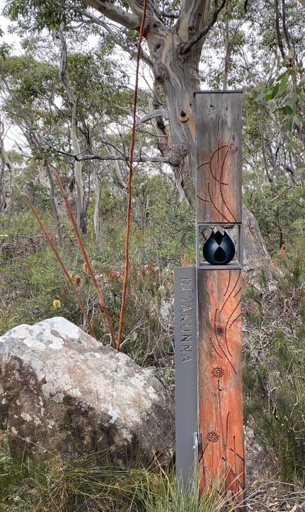 Three camps along the track provide overnight accommodation and cooking facilities. The entrance to the Ratakunna (‘Creaking Limbs’ in Tasmanian Aboriginal language) camp is graced by a sculpture depicting button grass, fire and spears, with highlights of ochre. Complementary designs are continued in the main camp where Aboriginal names of native animals are used. This reflects the intimate knowledge of nature developed over the millenia by Tasmanian Aboriginal people.
